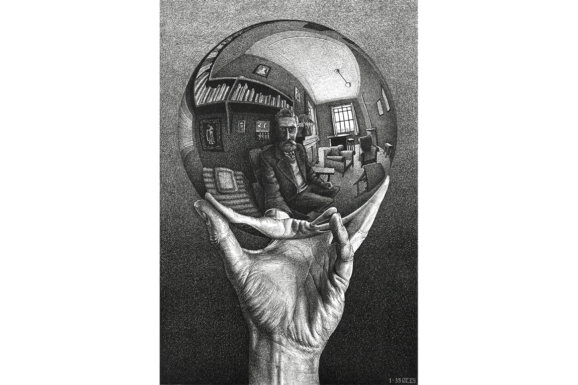 M.C. Escher’in “Elinde Küre Yansımalı Otoportre” adlı eseri, optik illüzyonun ve derin düşünsel tasvirin en güçlü örneklerinden biridir. Bu tablo, sanatçının elinde tuttuğu bir cam küre aracılığıyla kendi portresini ve çevresindeki odayı izleyiciye aktarmasıyla dikkat çeker. Eser, yalnızca bir otoportre değil; aynı zamanda algının, gerçekliğin ve insanın dünyaya bakış açısının sorgulandığı felsefi bir yorumdur.