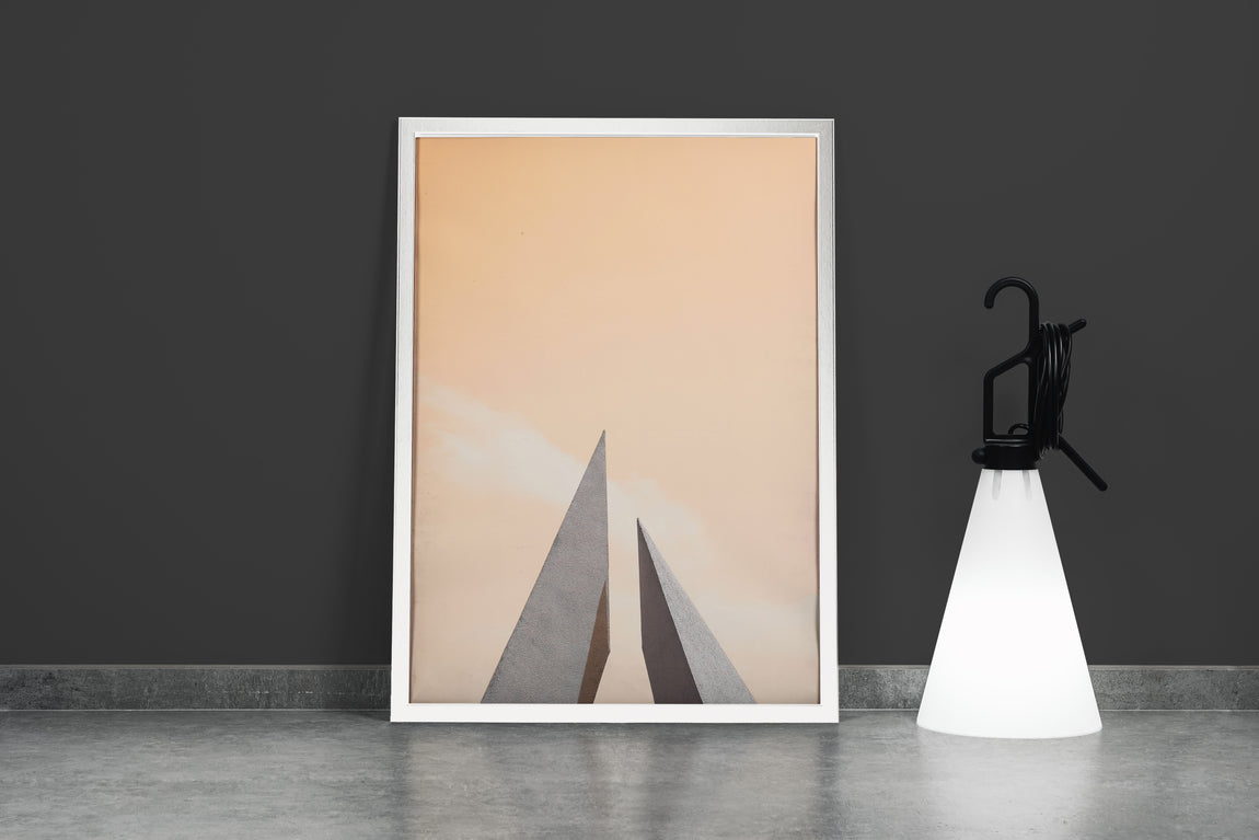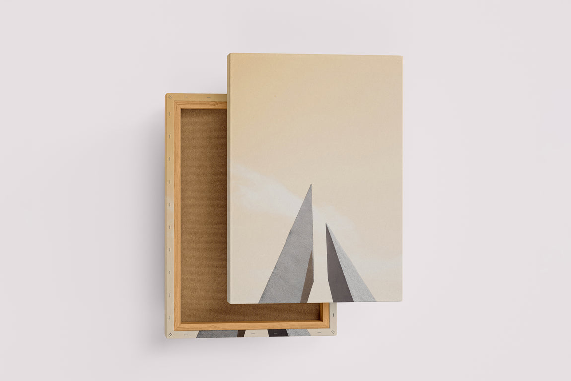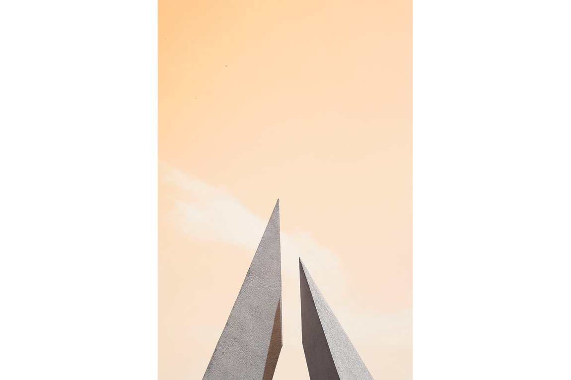 minimalist architectural photo of two sharp triangular structures against a warm pastel sky, abstract, art, kanvas tablo