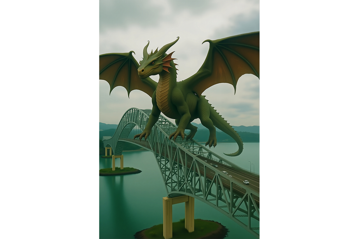 - Modern Mimari ve Doğa Uyumu: Arka plandaki modern asma köprü, temiz hatları ve mühendislik harikası yapısıyla, ejderhanın organik ve doğal formuyla ilginç bir tezat oluşturur. Köprünün altından akan sakin su ve çevresindeki yeşil tepeler, bu modern ve mitolojik unsurları doğal bir denge içinde bir araya getirir.