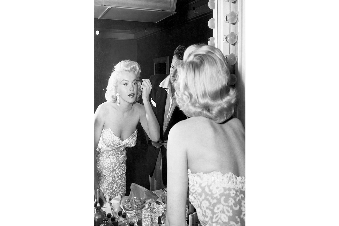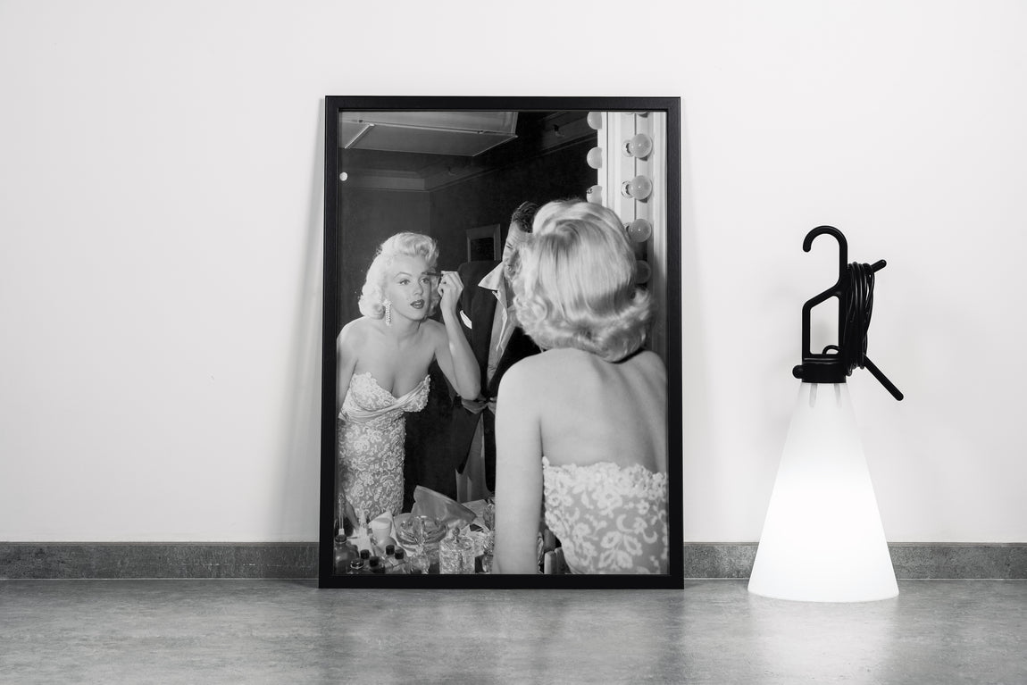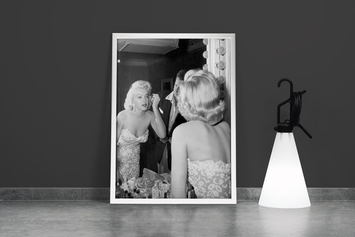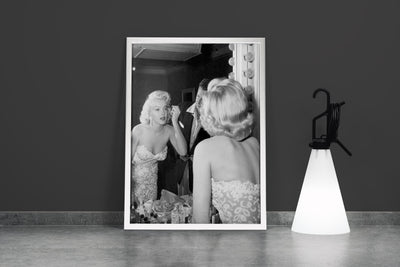 Bu fotoğraf, bizi kırmızı halıların ve stüdyo ışıklarının parlaklığından alıp, bir yıldızın oluşturduğu o sihirli mekana, yani kulise götürür. Marilyn Monroe'yu, spot ışıklarının altındaki o kusursuz imajını özenle hazırlarken, ayna karşısında makyajını yaptığı bir anda görürüz. Bu, onun bir film yıldızı olarak değil, bir kadın olarak en odaklanmış ve en doğal anlarından biridir. Bakışları kamerada değil, kendi yansımasındadır. Bu samimiyet, izleyiciye onunla kişisel bir bağ kurma imkanı tanır ve bir efsanenin insani yönünü gösterir. Ayna motifi, bu esere katmanlı bir anlam katar; hem gerçek Norma Jeane'i hem de dünyaya sunduğu "Marilyn Monroe" personasını aynı karede görmemizi sağlar.
