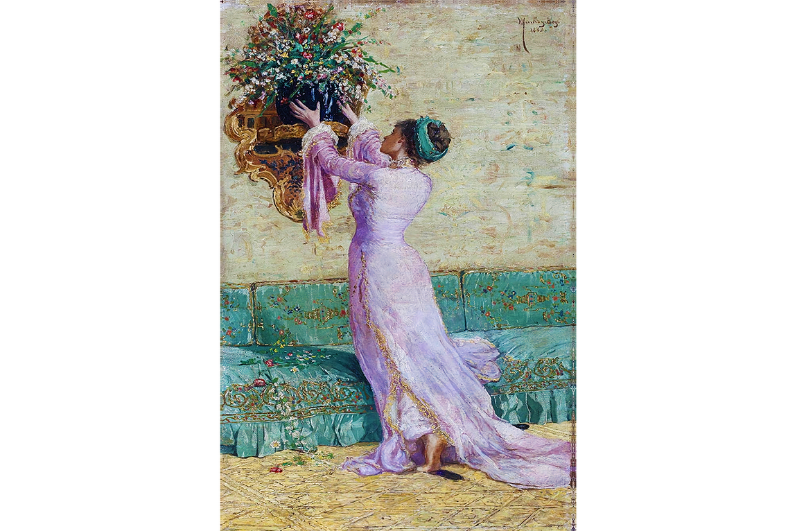 Türk sanatının en önemli isimlerinden biri olan Osman Hamdi Bey’in “Çiçek Yerleştiren Kadın” tablosu, estetik ve zarafetiyle dikkat çeken nadide bir eserdir. 19. yüzyılın sonlarında Osmanlı sanatında modernleşmenin öncülerinden biri olan sanatçı, bu eserinde gündelik hayatın zarif bir sahnesini ölümsüzleştirir. Mor tonlarda uzun bir elbise giymiş bir kadının, duvara asılı bir vazoya çiçek yerleştirdiği bu sahne, hem iç mekânın ihtişamını hem de kadının zarif hareketlerini ustalıkla betimler.