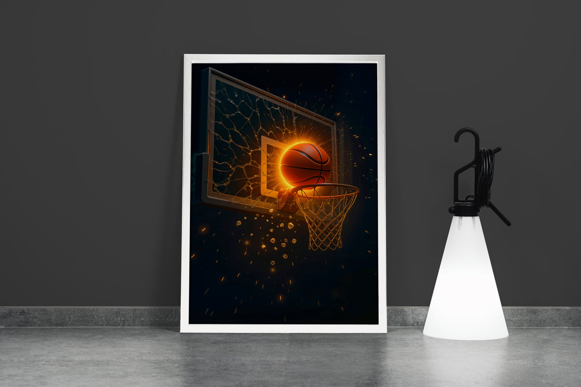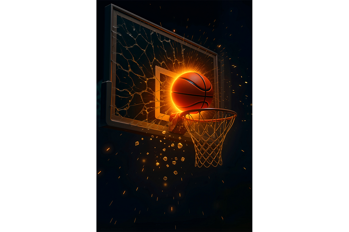 Bu eser, izleyiciyi bir basketbol maçının en doruk noktasına, en unutulmaz anına götürür: Panyayı kıran o efsanevi smaç. Kompozisyonun kahramanı, sadece bir basketbol topu değil, adeta bir alev topu, bir meteor gibi potaya yönelen, karşı konulmaz bir enerji küresidir. Bu, bir sporcunun tüm tutkusunu, hırsını ve adanmışlığını tek bir harekete yoğunlaştırdığı o "ateşten" anı simgeler. Topun potayla buluştuğu an, sıradan bir sayıdan çok daha fazlasıdır; bu, bir irade beyanı, bir güç gösterisi ve beklentilerin (ve cam panyanın) paramparça olduğu bir zafer anıdır. Eser, bu anlık ve şiddetli enerjiyi, etrafa saçılan kıvılcımlar ve parçalanan cam detaylarıyla, izleyiciyi koltuğuna çivileyecek bir drama ile sunar.