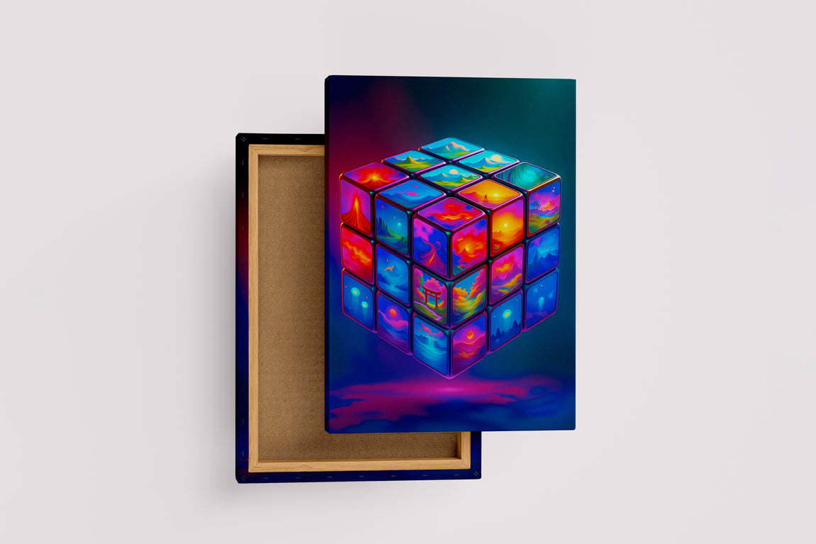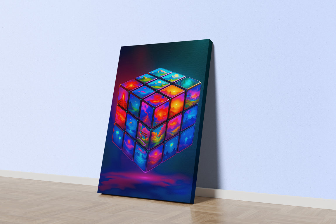 Modern dijital sanatın en canlı ve en hayalperest örneklerinden biri olan bu eser, şimdi popüler kültür ikonu zeka küpünü, içinde sonsuz dünyalar barındıran parlak bir objeye dönüştürerek mekanlarınıza geliyor. Bu kanvas tablo, sadece bir geometrik desen değil, aynı zamanda her bir karesi farklı bir maceraya, farklı bir manzaraya açılan, göz alıcı ve entelektüel bir başyapıttır.