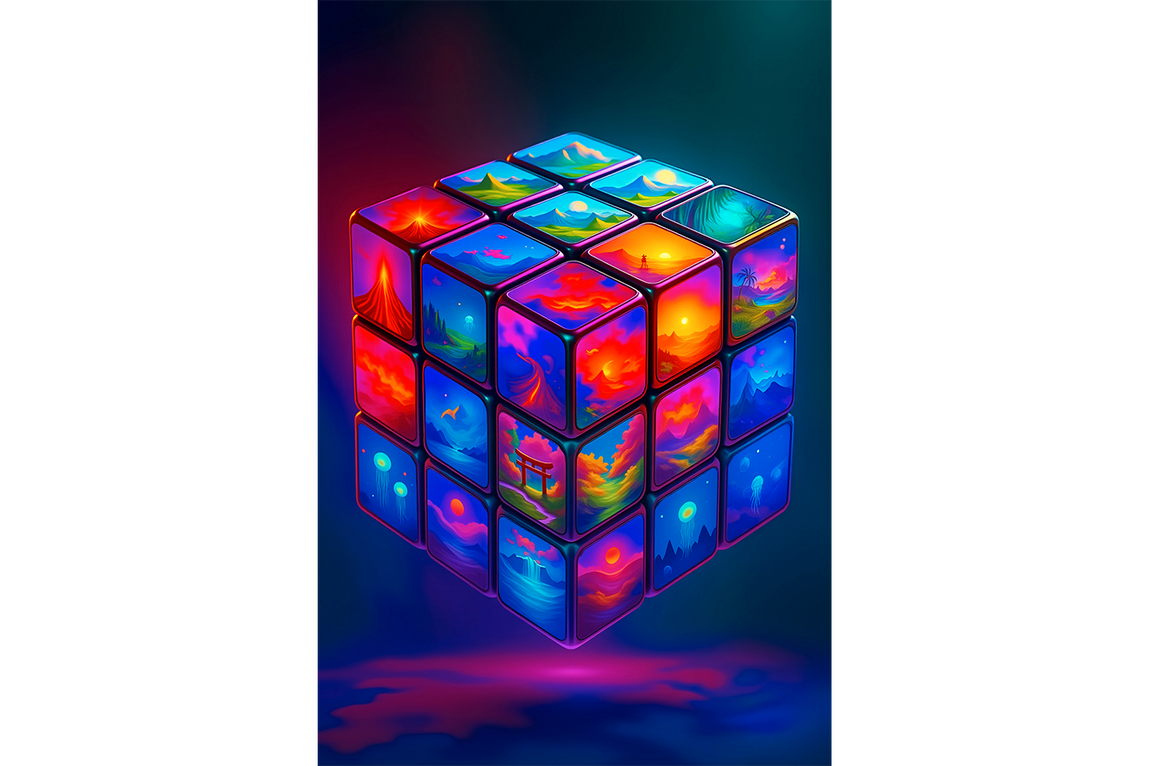 Bu eser, izleyiciyi bildiğimiz zeka küpü bulmacasının çok ötesine, felsefi bir yolculuğa çıkarır. Geleneksel olarak renkleri eşleştirmeye dayalı bu mantık oyunu, burada bambaşka bir amaca hizmet eder: Her bir kare, artık tek bir renk değil, başlı başına parlayan, yaşayan bir evrendir. Sanatçı, bu ikonik objeyi, içinde sayısız olasılık ve manzara barındıran bir "dünyalar kutusu" olarak yeniden tasarlar. Bir karede patlayan bir volkanın ateşli renklerini izlerken, hemen yanındakinde su altı dünyasının sakin maviliğinde kaybolabilir, bir diğerinde ise tropik bir gün batımının huzurunu bulabilirsiniz. Bu, hayatın kendisi gibi, sayısız farklı anın, duygunun ve mekanın bir araya gelerek nasıl karmaşık ama bir o kadar da ahenkli bir bütün oluşturduğunu anlatan güçlü bir metafordur.