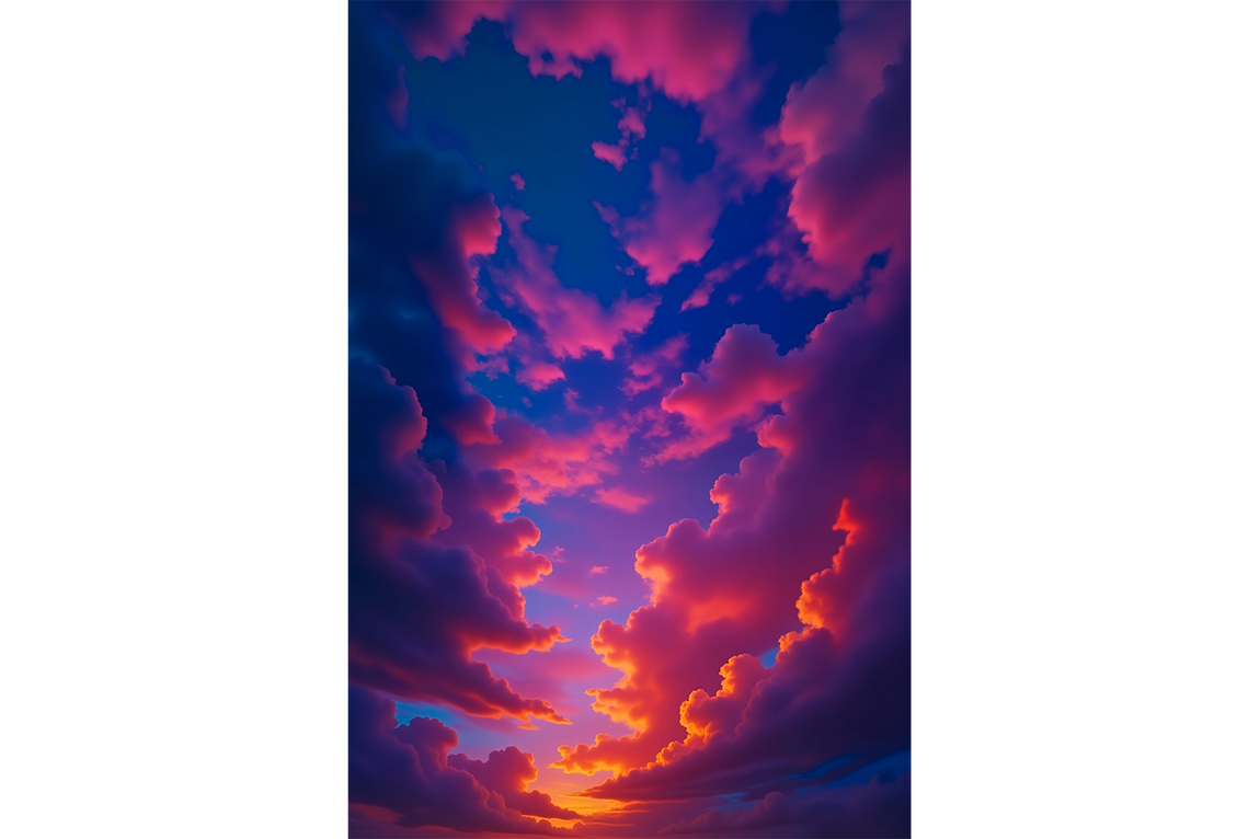 - Canlı ve Cüretkar Renk Paleti: Eserin gücü, sanatçının kullandığı doygun ve canlı renklerden gelir. Pembe ve turuncunun sıcaklığı, mavinin ve morun soğukluğuyla birleşerek, hem göz alıcı bir kontrast hem de dengeli bir uyum meydana getirir. Işığın bulutların kenarlarını aydınlatarak oluşturduğu parlak vurgular, sahneye adeta ilahi ve ruhani bir nitelik kazandırır.