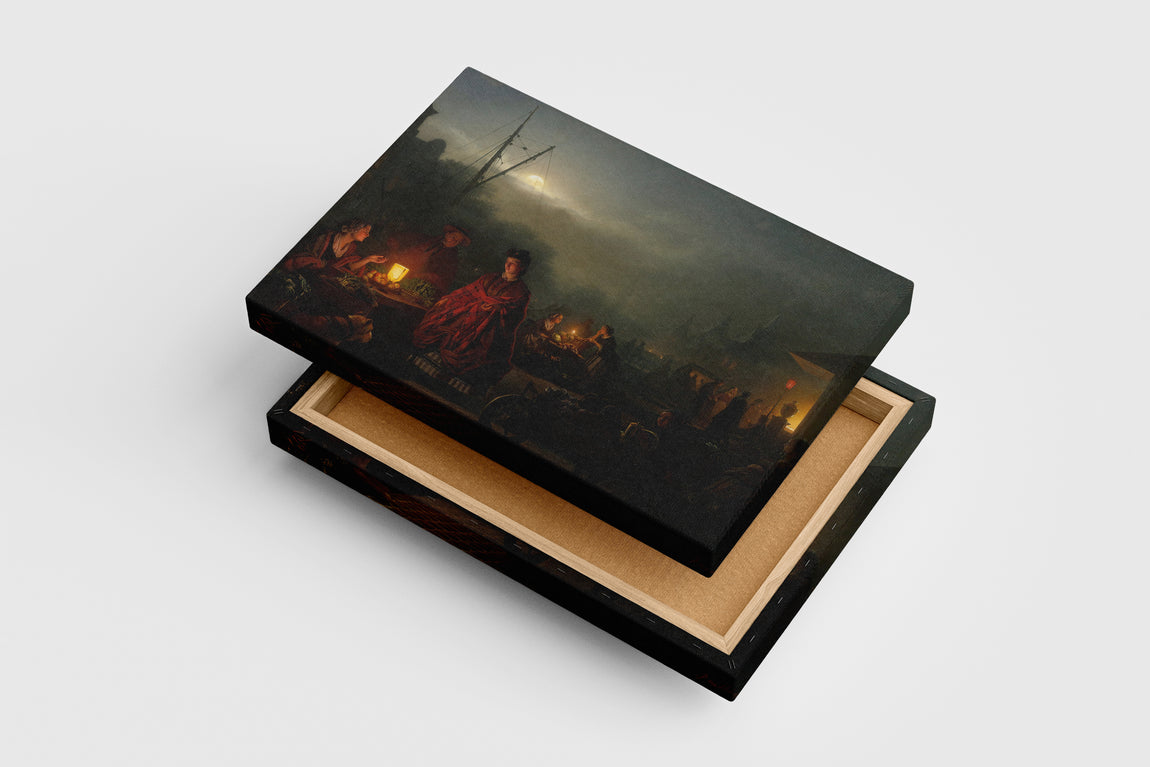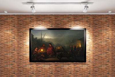Romantizm akımının en özgün ustalarından Petrus van Schendel'in imzası niteliğindeki "Ay Işığında Pazar Yeri" adlı eseri, şimdi mekanlarınıza 19. yüzyıl Avrupa'sının büyülü atmosferini ve ışığın o şiirsel dansını taşımak için kanvas tablo formunda. Bu eser, sadece bir gece manzarası değil, aynı zamanda bir ışık ustasının, ay ışığının serin zarafeti ile mum ışığının sıcak samimiyetini aynı tuvalde buluşturduğu, teknik bir şaheserdir.