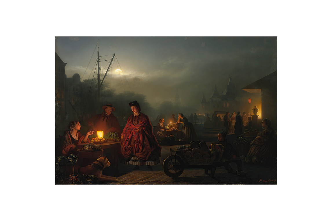 Hollandalı-Belçikalı ressam Petrus van Schendel, kariyerini neredeyse tamamen gece sahneleri üzerine, özellikle de yapay ışık kaynaklarının etkilerini betimlemeye adamıştır. Onu çağdaşlarından ayıran ve sanat tarihinde özel bir yere koyan şey, iki farklı ışık kaynağını – ayın gümüşi, soğuk ışığı ve mumların, fenerlerin altın sarısı, sıcak parıltısı – aynı kompozisyonda inanılmaz bir ustalıkla bir araya getirme yeteneğidir. Bu tablo, sanatçının bu konudaki dehasının en parlak örneklerinden biridir. Eser, izleyiciyi adeta zamanda geriye götürerek, sakin bir Avrupa gecesinde, ay ışığı altındaki bir pazar yerinin canlı ama huzurlu atmosferine davet eder.