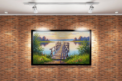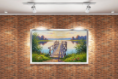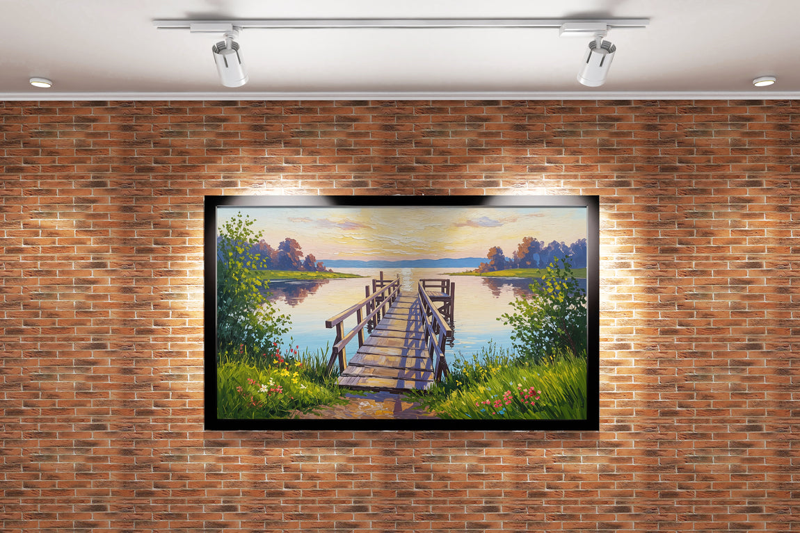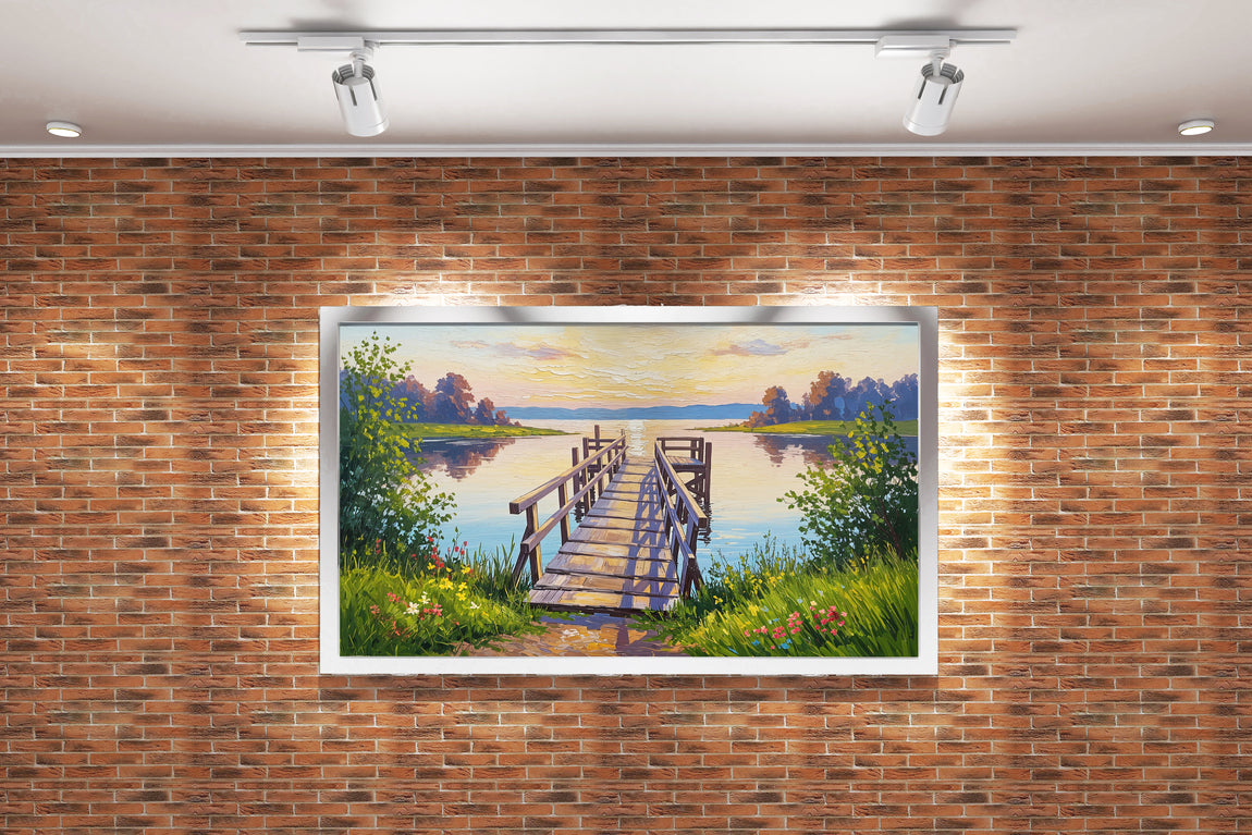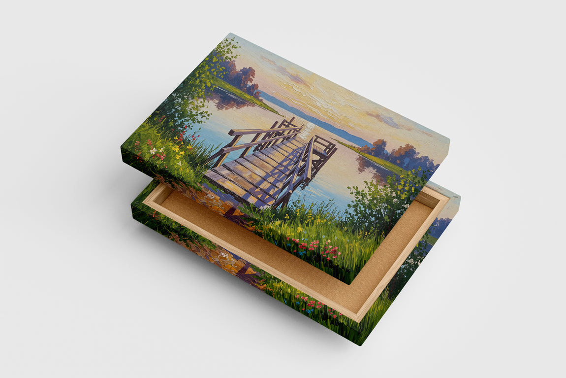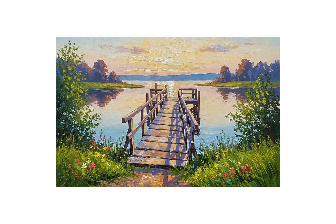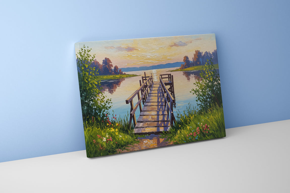 pier and nature view by the river with colorful flowers model 1, view, ai art, art, kanvas tablo