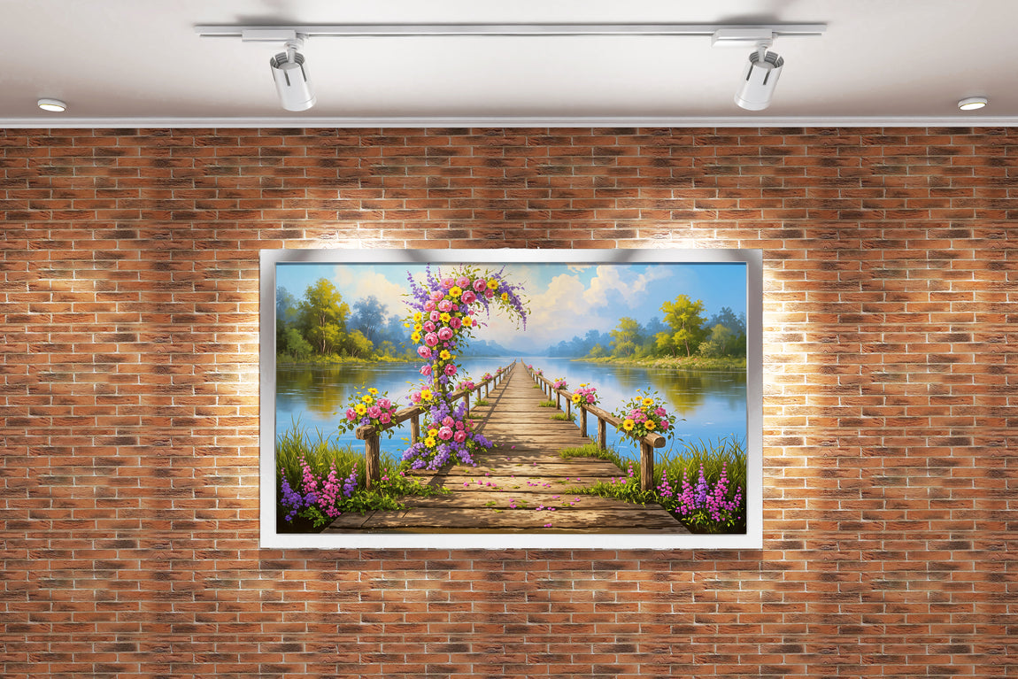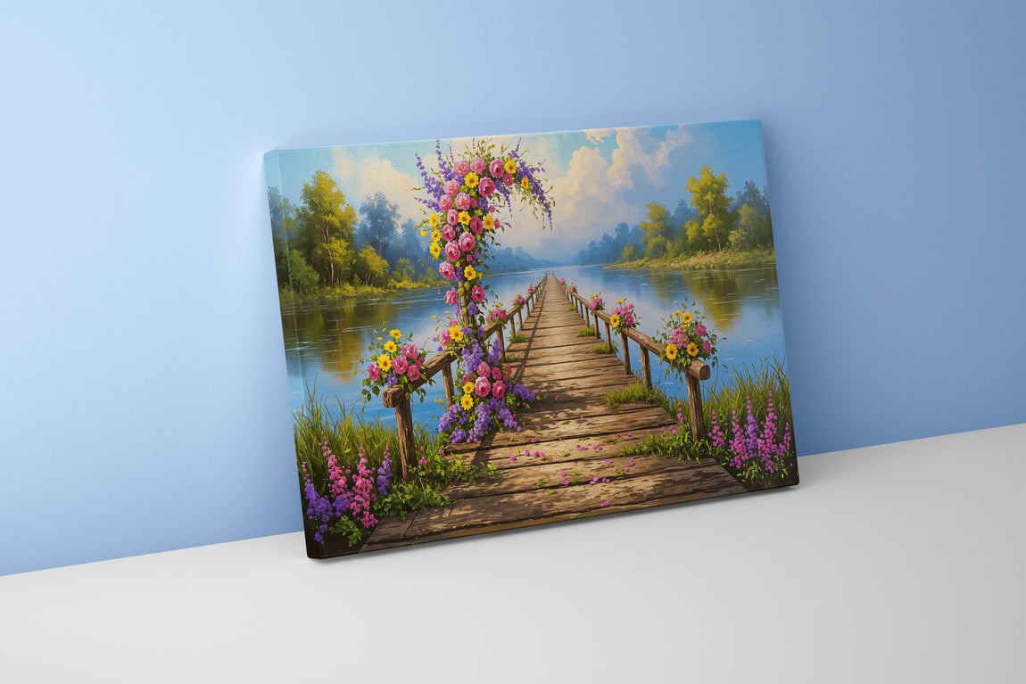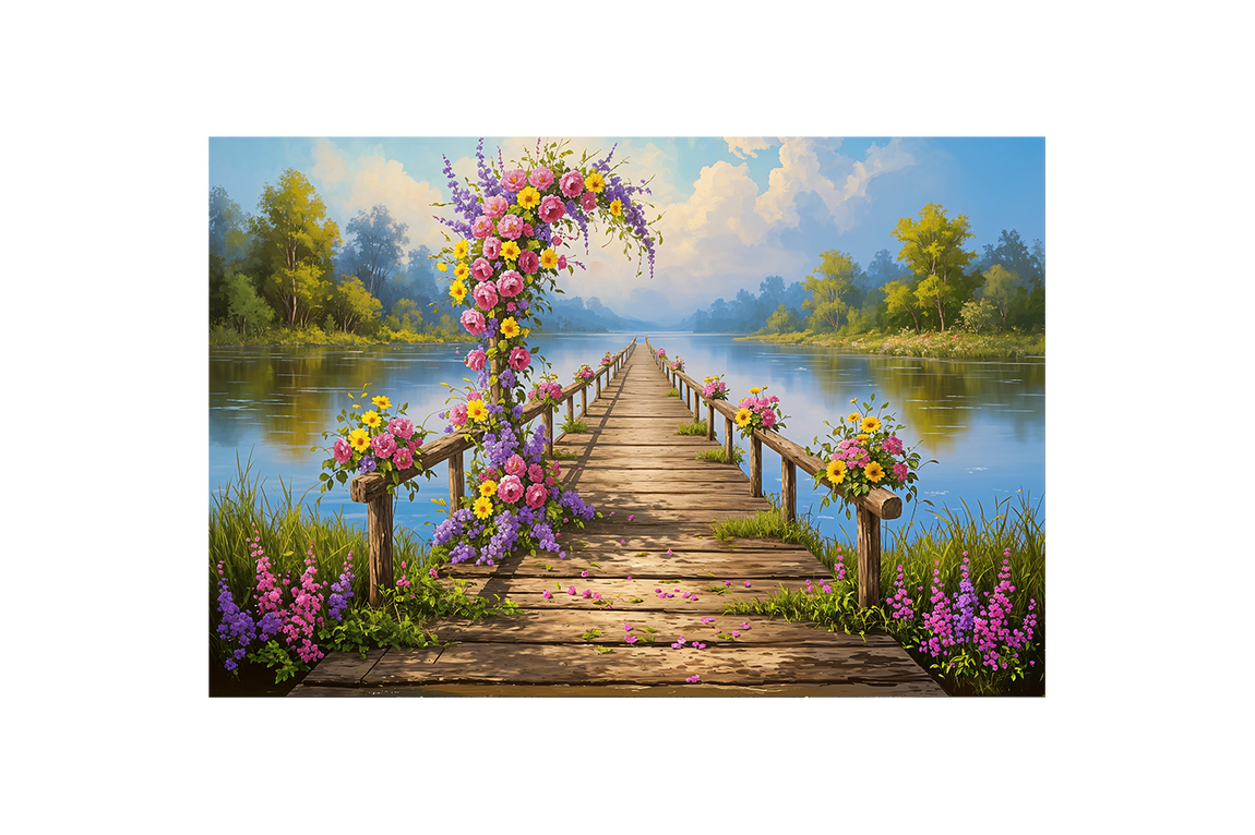 pier and nature view by the river with colorful flowers model 2, view, ai art, art, kanvas tablo