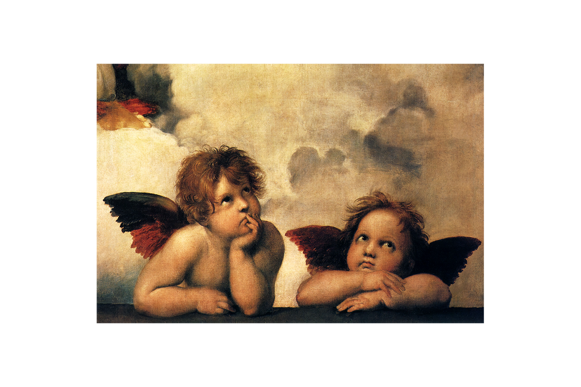Yaklaşık 1512 yılında tamamlanan "Sistine Madonna", Meryem Ana'yı kucağında bebek İsa ile tasvir eden, Yüksek Rönesans'ın en önemli eserlerinden biridir. Tablonun en altındaki pervaza dayanmış halde duran bu iki melek, ana sahnedeki kutsal olayı sıkılmış ama sevimli bir ifadeyle izlerler. Efsaneye göre Raffaello, bu melekleri bir fırının penceresinden içeri hasretle bakan iki sevimli çocuktan esinlenerek resmetmiştir. Bu hikayenin doğruluğu ne olursa olsun, meleklerin insani ve doğal ifadeleri, onları ilahi varlıklardan çok, yaramaz ama sevimli çocuklara benzetir ve bu da onların yüzyıllardır süren popülaritesinin anahtarıdır. Onlar, cennetin sıkılmış sakinleri, ilahi olanla dünyevi olan arasındaki sevimli bir köprüdür.