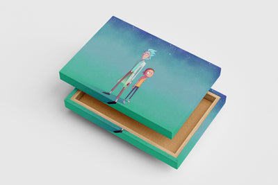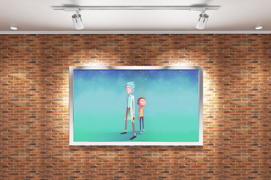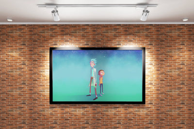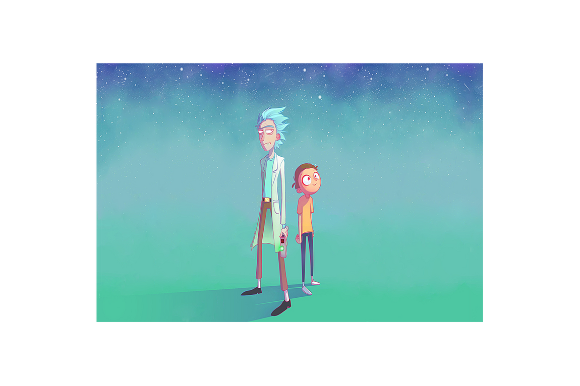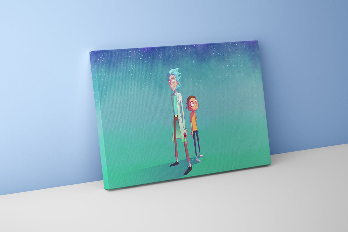 rick and morty standing together under a beautiful, serene starry night sky, anime, art, kanvas tablo