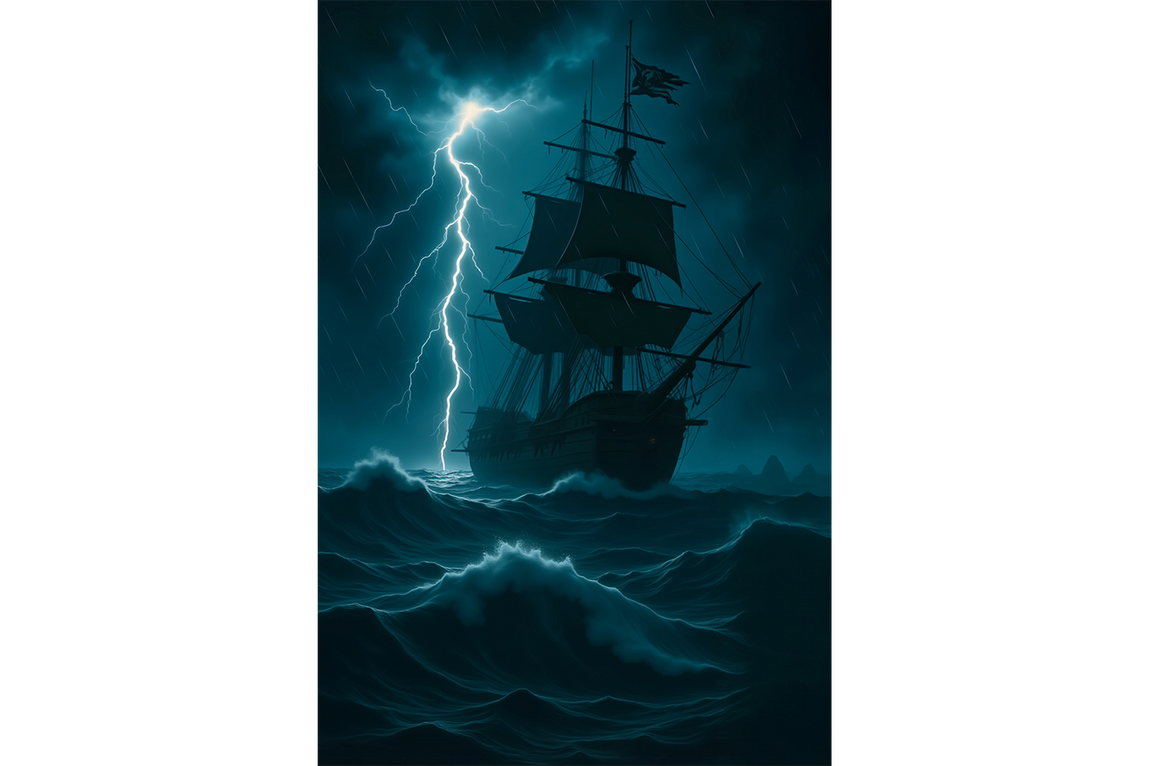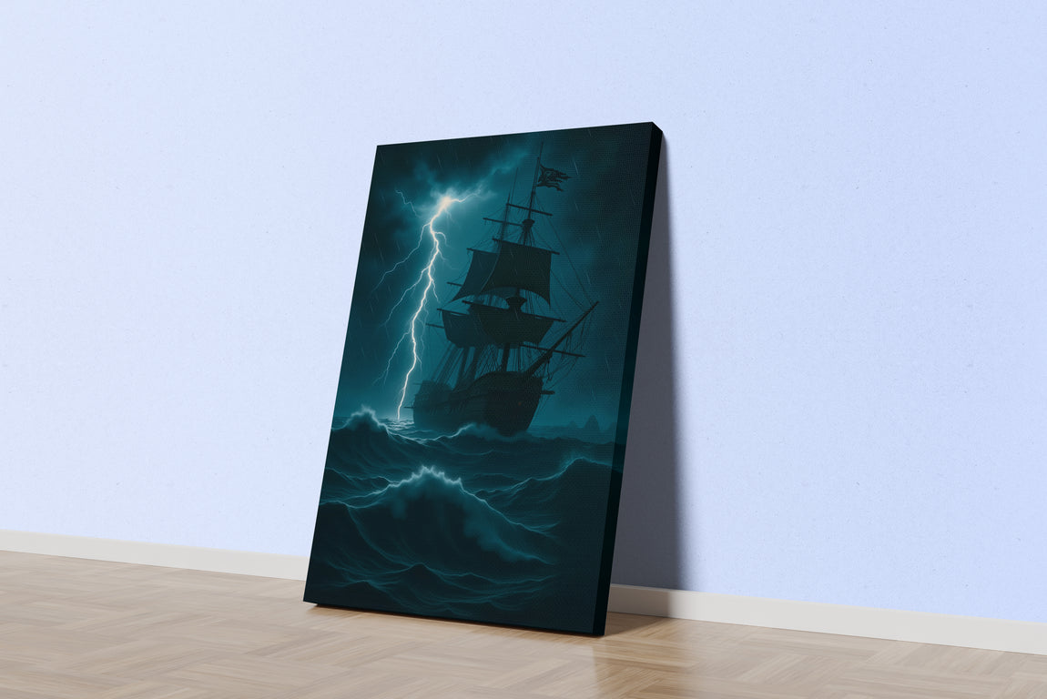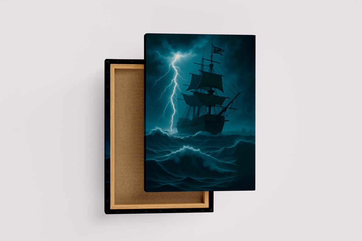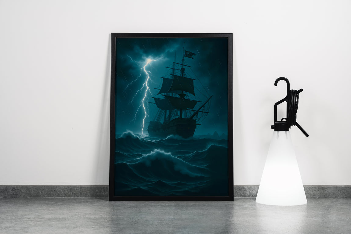 Bu eser, izleyiciyi karanlık ve fırtınalı bir gecede, okyanusun ortasında amansız bir mücadelenin tam kalbine götürür. Kompozisyonun kahramanı, korsanlık veya keşif çağlarını anımsatan tarihi bir yelkenli gemidir. Dev dalgalarla boğuşan bu gemi, doğanın ezici gücü karşısında ne kadar küçük ve kırılgan olduğunu gösterir. Ancak tüm bu kaosun ortasında, gökyüzünü yaran dev bir şimşek, sahneyi anlık olarak aydınlatır. Bu, hem bir tehlike anı hem de karanlığın içinde yol gösteren bir aydınlanma anıdır. Eser, bu anlık ışık patlamasıyla, en zorlu fırtınaların bile kendine has bir güzelliği ve görkemi olduğunu hatırlatır. Bu, hayatta kalma, dayanıklılık ve macera ruhuna yapılmış görsel bir övgüdür.