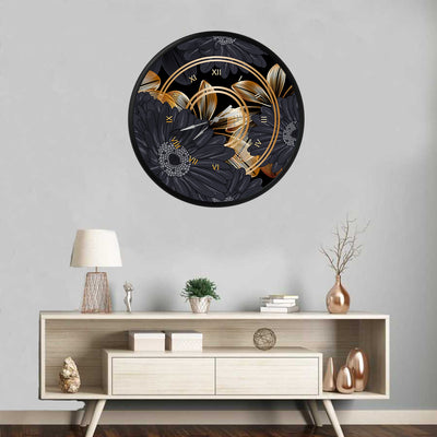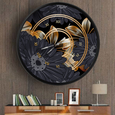 siyah ve altın yaldızlı çiçekler, MDF duvar saati