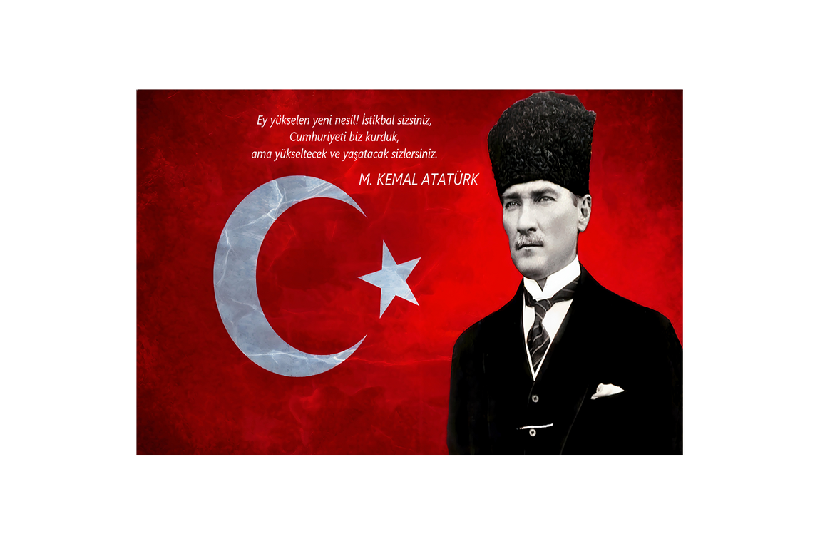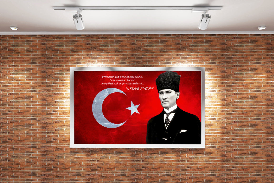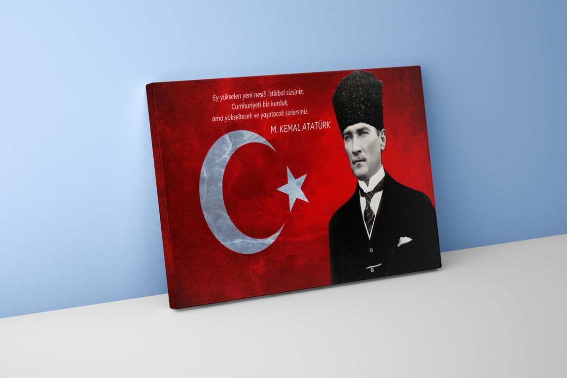 Türk bayrağı ve Atatürk görselinin özenle işlendiği bu baskı, duvarlarınıza anlam ve estetik katacak. Canlı renkleri ve net detayları sayesinde mekânlarınıza güçlü bir atmosfer kazandırır. Dayanıklı malzemesi uzun ömürlü kullanım sağlar ve kolayca asılabilir. Ev veya ofis dekorasyonunuza karakter katmak için ideal seçimdir.
