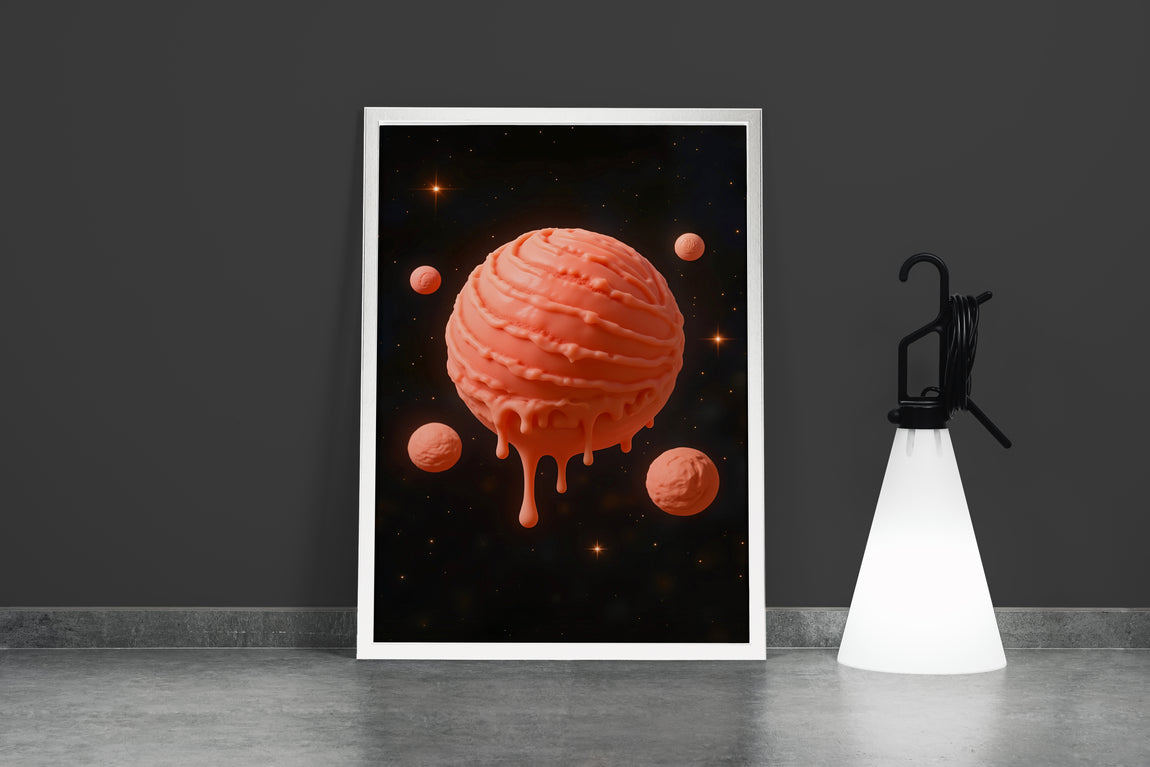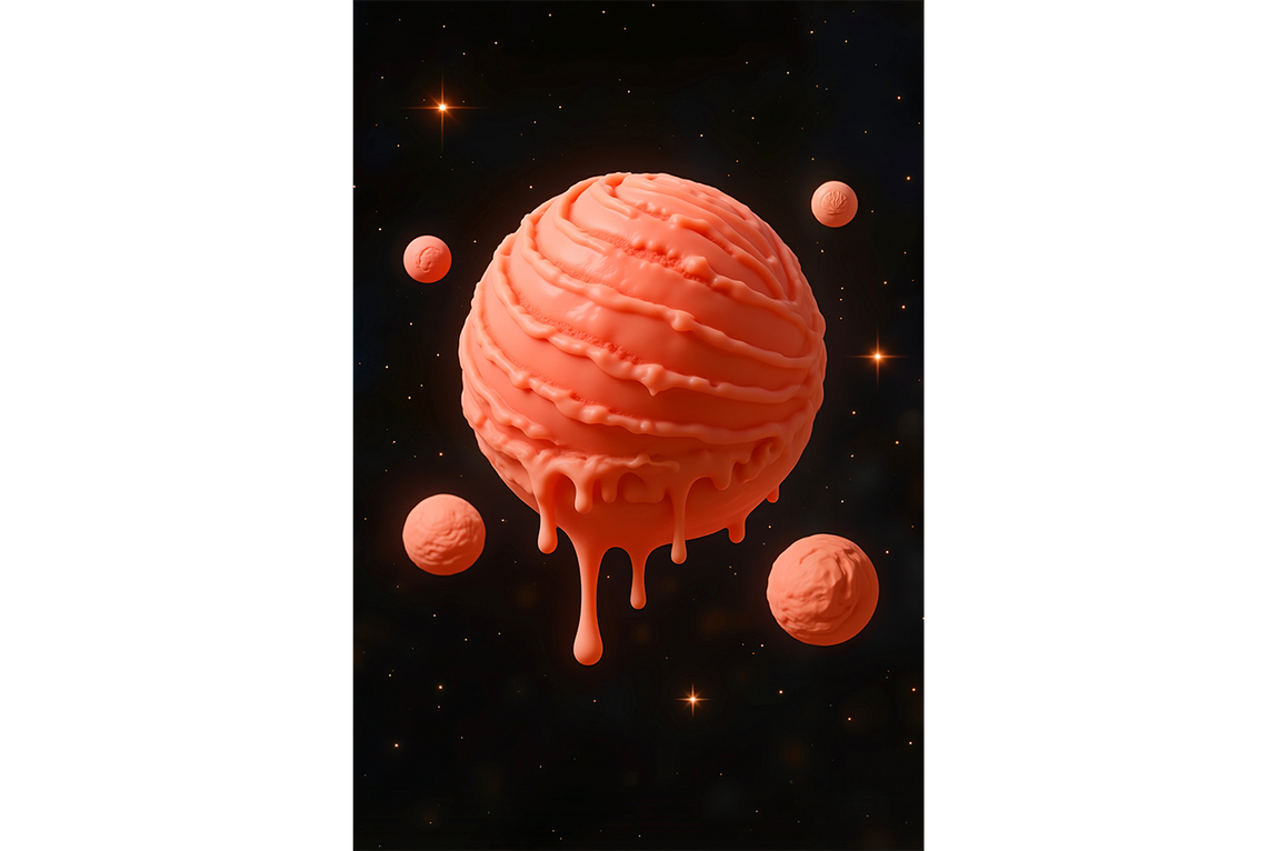 Bu eser, izleyiciyi "Ya gezegenler en sevdiğimiz tatlılardan olsaydı?" sorusunu sormaya davet eden, tamamen hayal ürünü bir evrene götürür. Kompozisyonun yıldızı, yıldızlarla dolu uzay boşluğunda süzülen, devasa bir top pembe dondurmadır. Bu sadece bir dondurma değil, aynı zamanda yörüngesinde daha küçük dondurma toplarından oluşan "uyduları" olan bir gezegendir. Sanatçının ustalığı, bu absürt ve eğlenceli fikri, üç boyutlu modelleme ve hiperrealist bir teknikle son derece inandırıcı bir şekilde betimlemesinde yatar. Dondurmanın dokusu, üzerindeki kıvrımlar ve sıcaktan (belki de bir yıldızın sıcaklığından?) eriyip damlayan kısımları, esere hem gerçekçi hem de iştah açıcı bir nitelik kazandırır. Bu, ciddiyetten uzak, saf bir neşe ve hayal gücü kutlamasıdır.