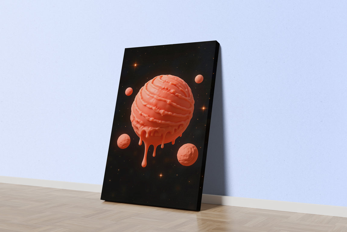 Hayal gücünün en tatlı ve en eğlenceli halini yansıtan bu eser, şimdi mekanlarınıza hem neşeli bir renk katmak hem de yüzünüzde bir tebessüm oluşturmak için kanvas tablo formunda. Bu tablo, evrenin sonsuz boşluğunu, hepimizin en sevdiği tatlılardan biri olan dondurma ile birleştirerek, hem esprili hem de görsel olarak çarpıcı, modern bir Pop Art yorumu sunar.