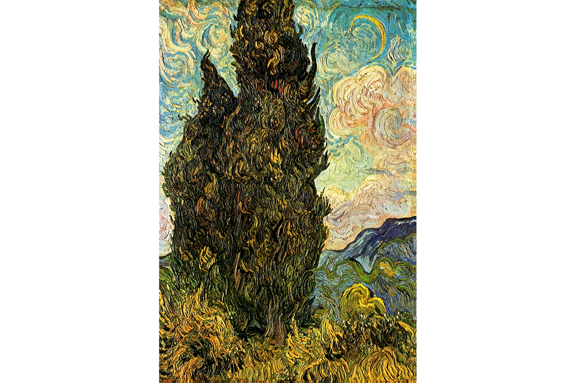 Vincent van Gogh’un eserleri, sanat tarihinde yalnızca görselliğiyle değil, aynı zamanda ruhsal derinliğiyle de öne çıkar. Hollandalı ressamın doğaya duyduğu yoğun ilgi, onun tablolarında sık sık kendini gösterir. Selvi ağaçlarını konu alan bu tablo, Van Gogh’un doğayı yorumlama biçiminin güçlü bir örneğidir. Tablodaki kıvrımlı fırça darbeleri, hareketli gökyüzü ve güçlü ağaç formu, ressamın içsel dünyasını dışa vuran bir aktarım niteliği taşır.
