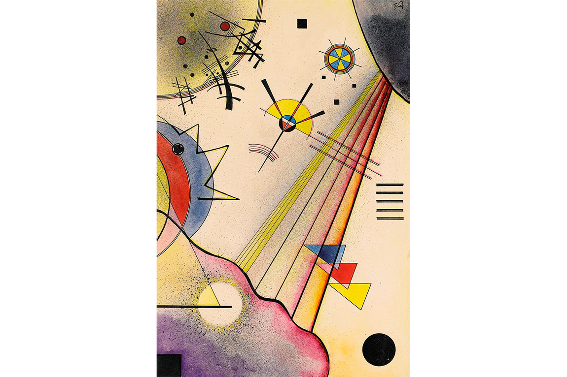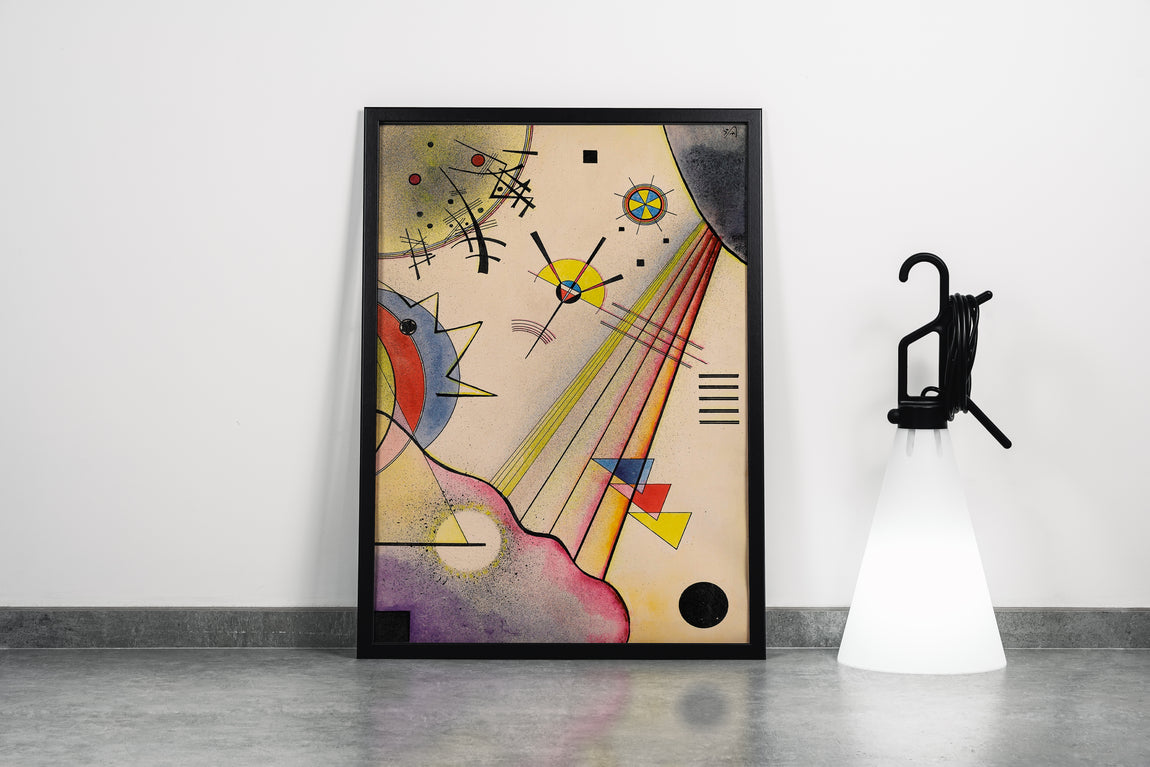 Wassily Kandinsky, soyut sanatın öncülerinden biri olarak renk, çizgi ve form arasındaki ilişkiyi müzikal bir düzen içinde ele alan kompozisyonlarıyla tanınır. Bu çalışma, geometrik şekillerin (üçgen, daire, kare) ritmik dengesi ve renklerin etkileşimi ile güçlü bir görsel dil sunar. İnce çizgiler, kesişen eksenler ve akışkan geçişler; hareket, denge ve enerji kavramlarını aynı yüzeyde sergiler. Sarı, kırmızı, mavi ve siyahın kontrastı; gözün tablo üzerinde gezinmesini sağlayan bir akış oluşturur. Bauhaus yaklaşımının yalın ama etkili estetiği, çağdaş yaşam alanlarında son derece uyumlu bir görünüm sağlar.