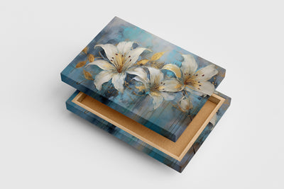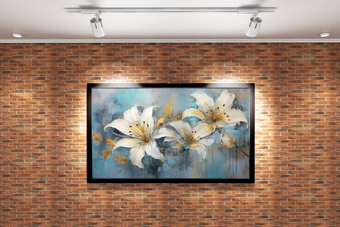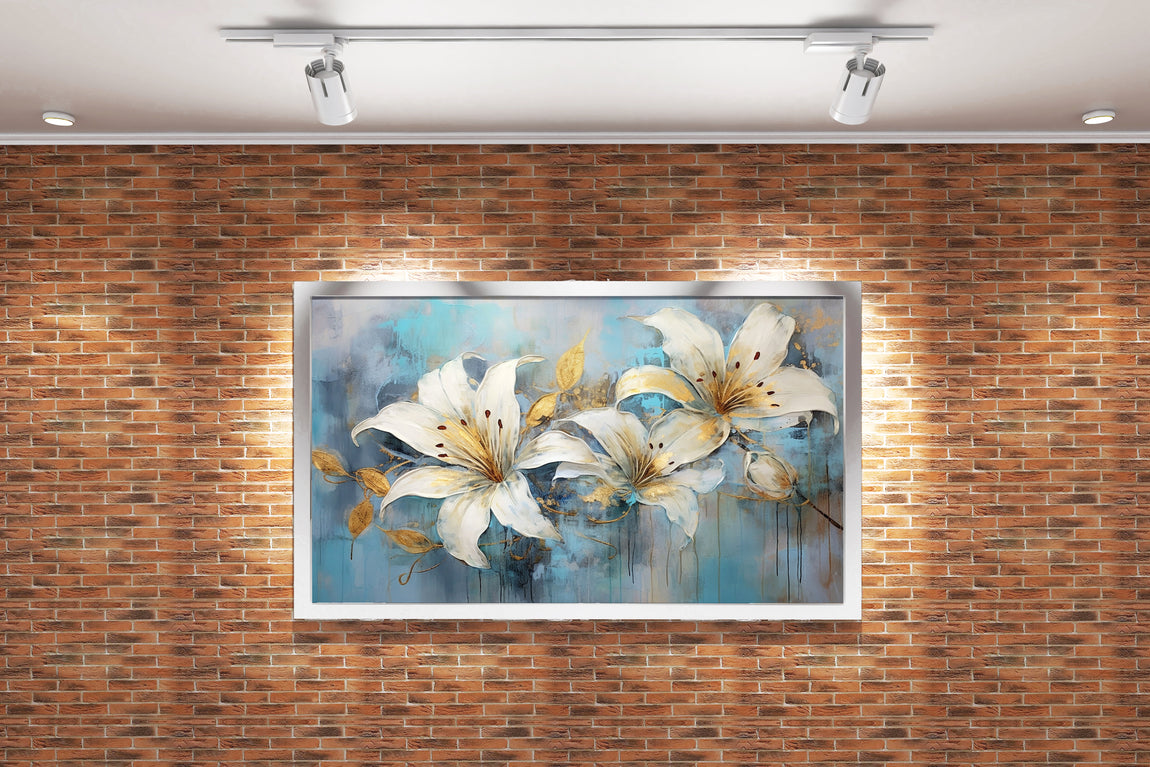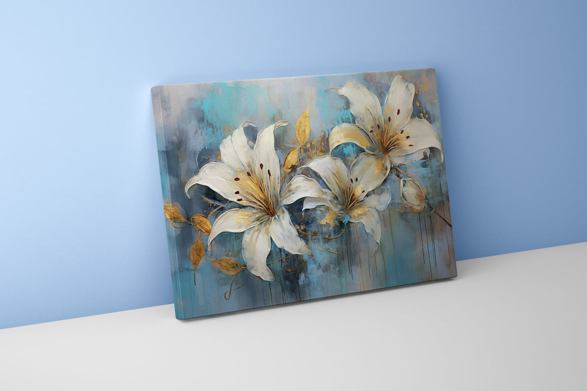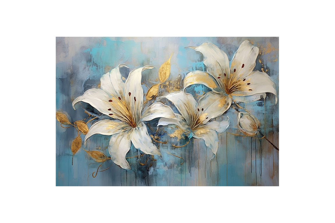 Saf beyaz zambaklar, altın yaprak detaylarıyla zarifçe birleşirken, dokulu ve damlayan mavi arka plan sakinlik ve derinlik hissi verir. Bu sanat eseri, yaşam alanlarınıza sofistike bir dokunuş katarken atmosferi canlandırır ve sanat tutkunlarının beğenisini kazanır. Özgün renk uyumu ve detaylı işçiliği sayesinde her ortamda dikkat çeker.