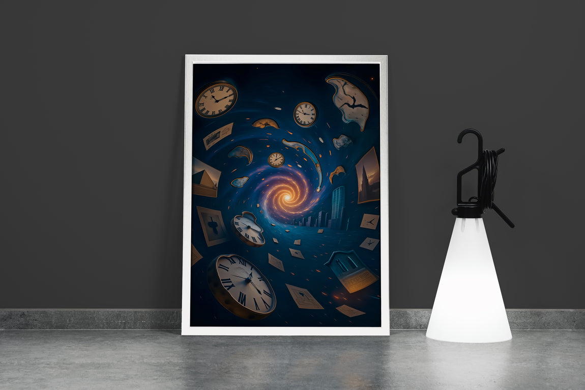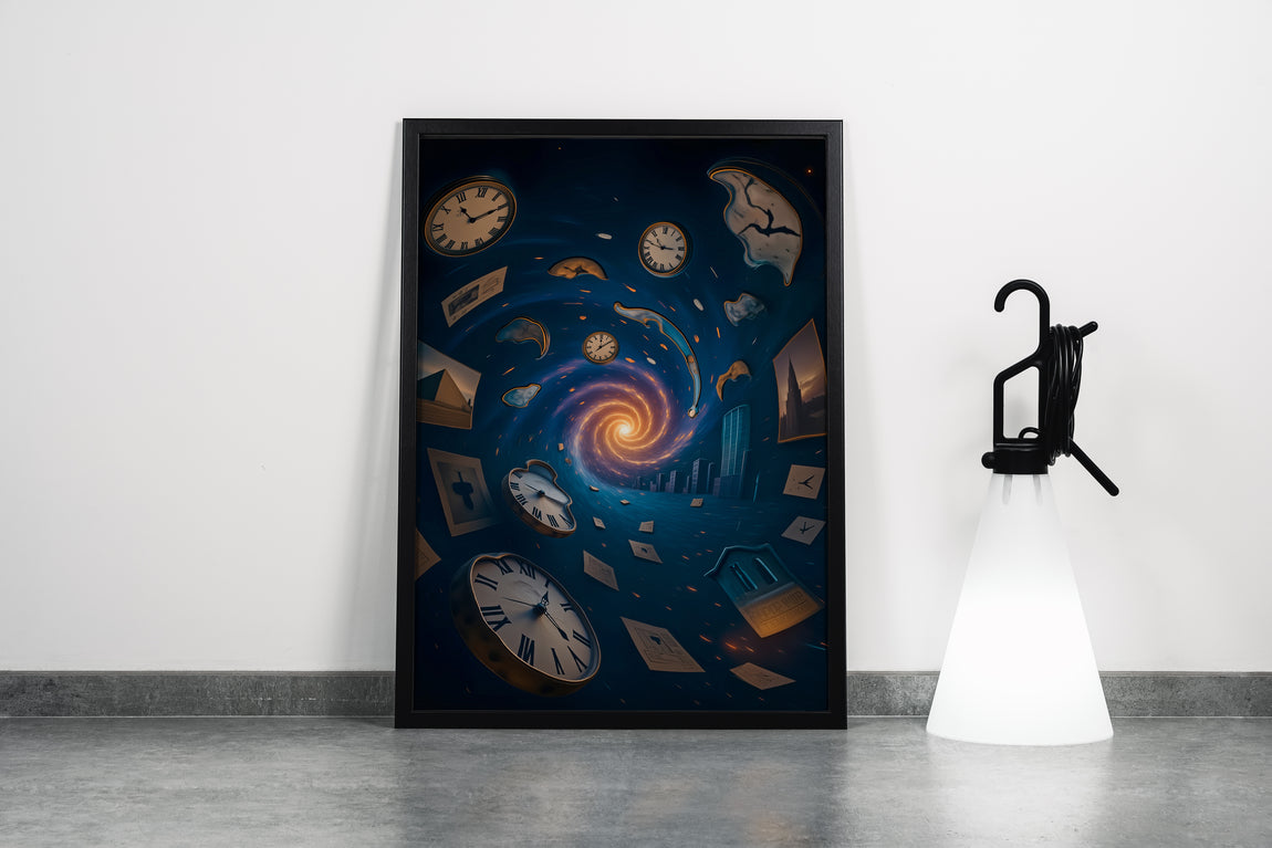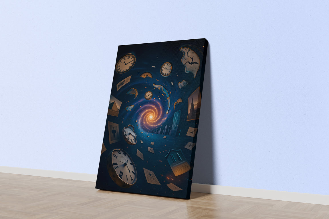 Modern Sürrealizmin en çarpıcı ve en düşündürücü örneklerinden biri olan "Zamanın Girdabı", şimdi zaman, bellek ve varoluş üzerine felsefi bir yolculuğu mekanlarınıza taşımak için kanvas tablo formunda. Bu eser, izleyiciyi adeta içine çeken baş döndürücü bir kompozisyonla, modern yaşamın karmaşası içinde zamanın göreceli doğasını ve anıların akışkanlığını sorgulayan, dinamik ve entelektüel bir başyapıttır.