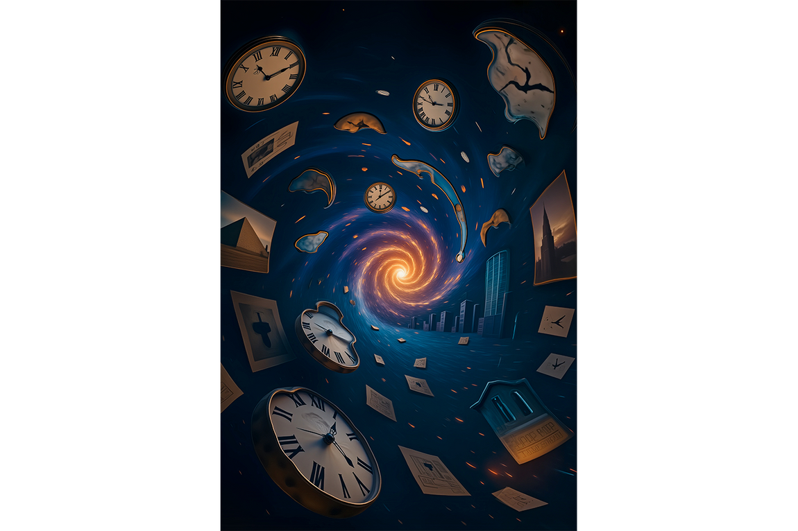 Bu eser, klasik Sürrealist ustalara, özellikle de Salvador Dalí'nin "eriyen saatler" imgesine modern bir saygı duruşunda bulunur. Ancak bu temayı, günümüzün dijital ve kozmik estetiğiyle birleştirerek tamamen yeni bir boyuta taşır. Kompozisyonun merkezindeki parlak ve çekici girdap, bir karadelik, bir solucan deliği veya belki de belleğin sonsuz derinliklerini simgeleyen bir portal görevi görür. Bu girdabın etrafında, zamanın farklı hallerini temsil eden saatler ve belleğin parçalarını simgeleyen anı fotoğrafları ve belgeler savrulur.